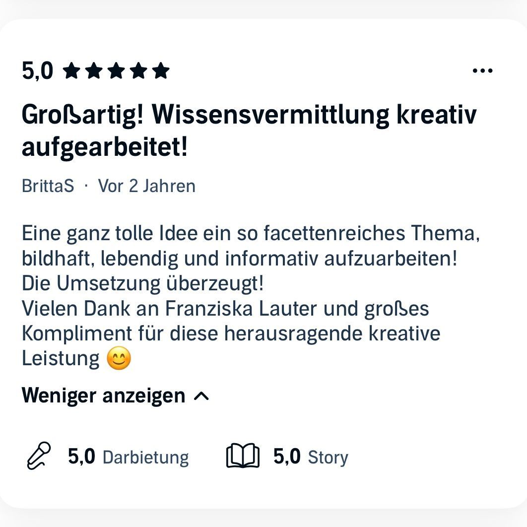 Seit Ende 2019 recherchiert und schreibt Franziska zu dem Thema "Psychologie der Kreativität". 2021 veröffentlichte sie das Hörspiel "Kreativität - Die unsichtbare Dirigentin". In 2022 veröffentlichte sie ihr zweites Hörspiel "Das verlorene Manuskript - Die Suche nach Dr. Esrahydra". Franziska ist Legasthenickerin und weiß bis heute oft nicht, wie man das schreibt. Kommata und Earl Grey Tee gehören ebenfalls zu ihren Schwächen. Ihre gesamte Biografie findest Du unter "Ausführliche Biografie".