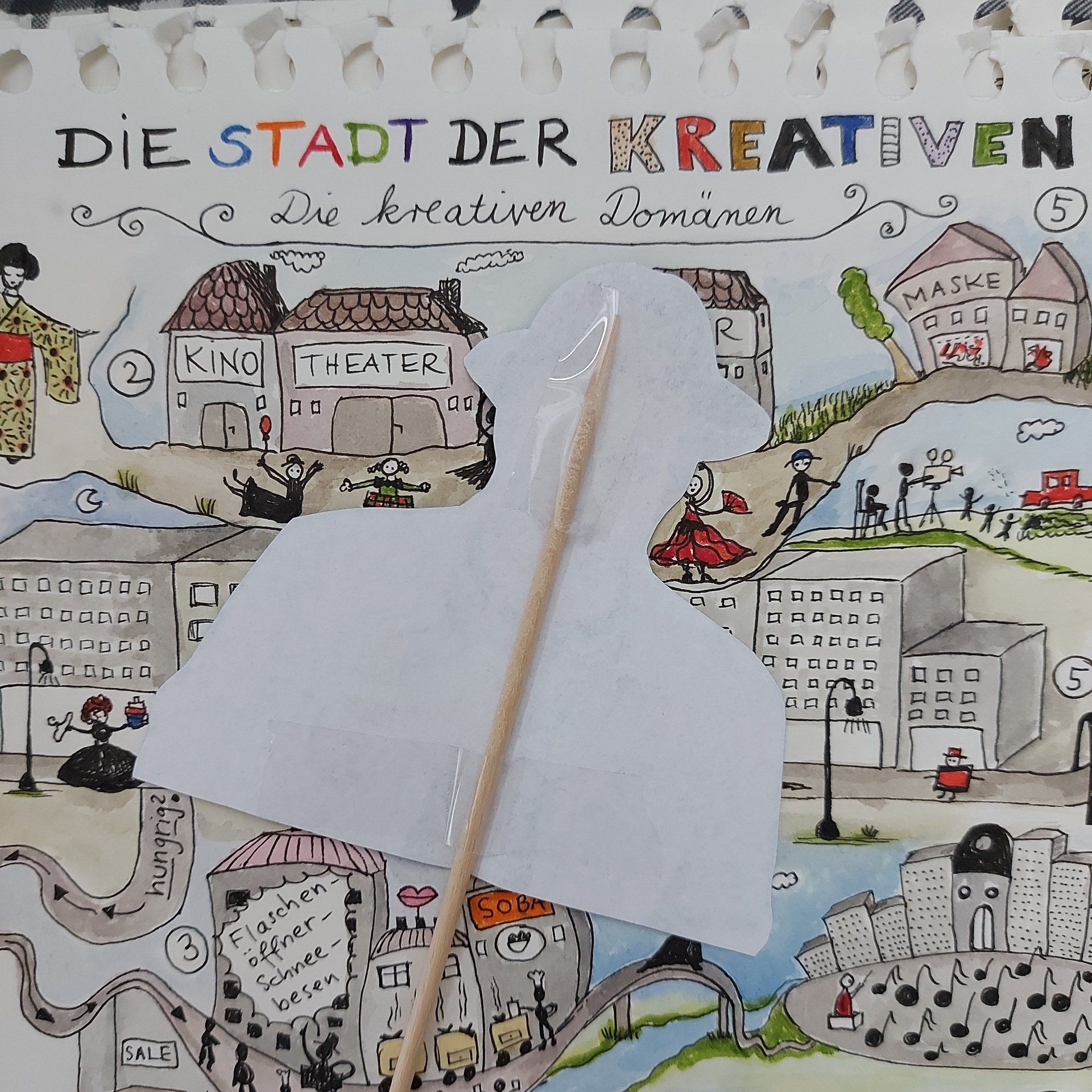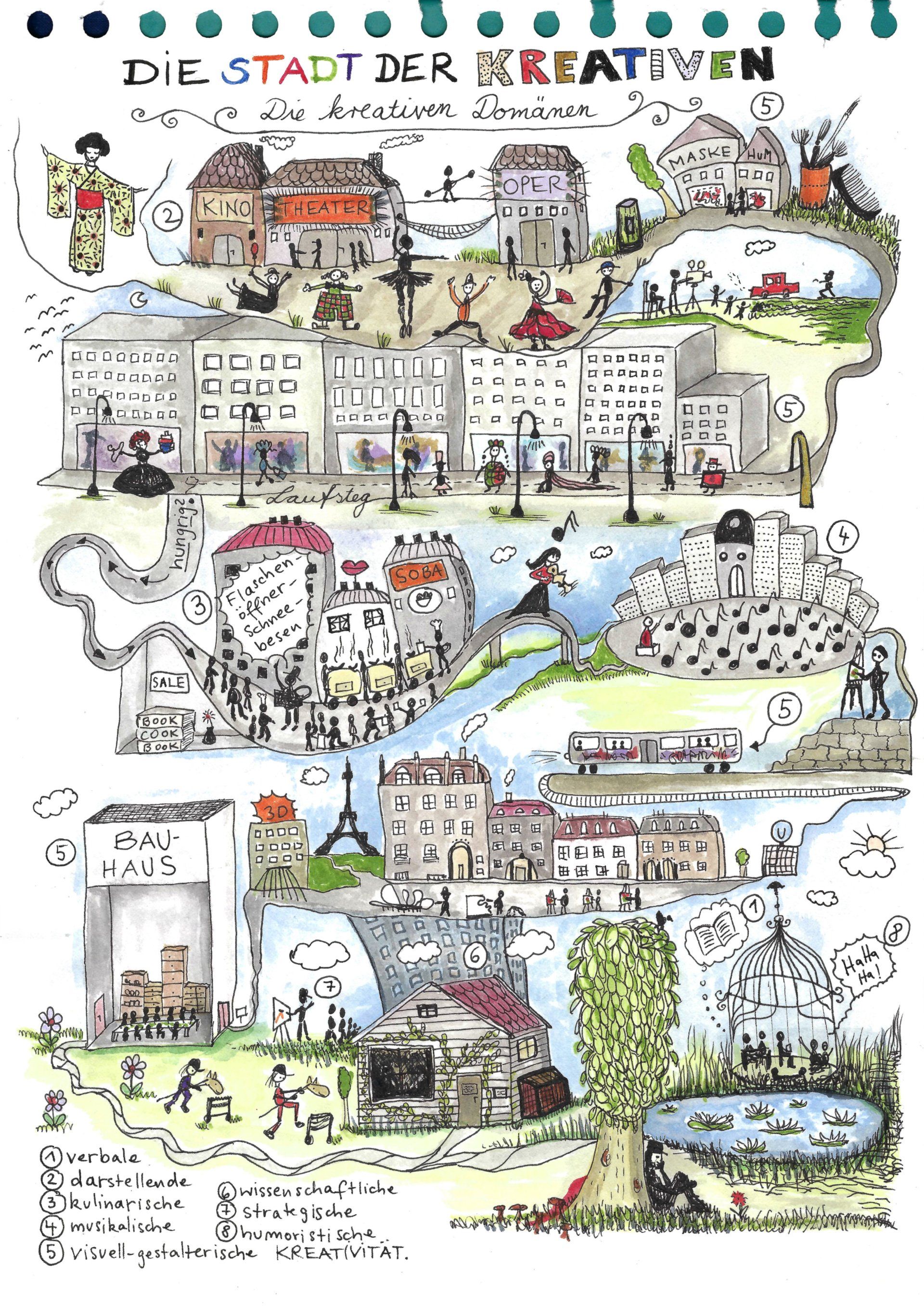 Auf der Suche nach dem Strawinsky Platz, auf dem ein großes Konzert stattfinden soll, lerne ich die Stadt der Kreativen und alle kreativen Domänen kennen. Nach dem großen Konzert, das überraschenderweise von der Gestalt dirigiert wird, endet mein Rundgang im Altbau des „Zentrums für Kreativitätsforschung“… einer Gartenlaube.