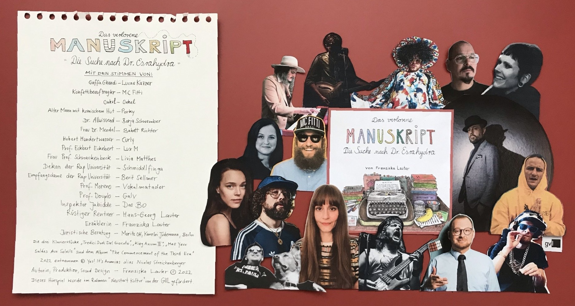 Das Bo, MC FiTTi, Galv, Curly, Vokalmatador, Porky (Deichkind), Doktor Allwissend, Onkel (Meute, Tschika 16/21), Schmiddlfinga, Livia Matthes, Lucas Kazzer (Gaffa Ghandi), Lux M, Babett Kazzer (Mriodom), Berit Sellmer, Hans-Georg Lauter und Franziska Lauter.